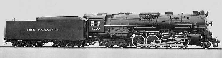 "The Pere Marquette Railroad's 2-8-4s were another variation on the Advisory Mechanical Committee's Berkshire design, sharing features with those of five other railroads. They had 69-inch drivers, 26x34-inch cylinders, and a boiler pressure of 245 p.s.i. They had a locomotive weight of 442,500 pounds and produced 69,368 pounds of tractive effort. Their evaporative heating surface totaled 4777 square feet, their superheater surface 1932 square feet, and their grate area 90 square feet. Lima Locomotive Works built all the Pere Marquette's 39 2-8-4s. Below, #1222 poses for the builder's photo of the N-1 class that was delivered in 1941. With the Pere Marquette's merger into the Chesapeake & Ohio in 1947 these Berkshires were to be renumbered into the C&O 2600 series, but the renumbering was never applied to the N-1 and N-2 classes. Retirement of the former PM 2-8-4s was complete by 1957, though some were not scrapped until 1961. Two of them survived the torch and #1225 is operational at the Steam Railroading Institute in Owosso, Michigan." (From: "Guide to North American Steam Locomotives" compiled by the late George H. Drury)