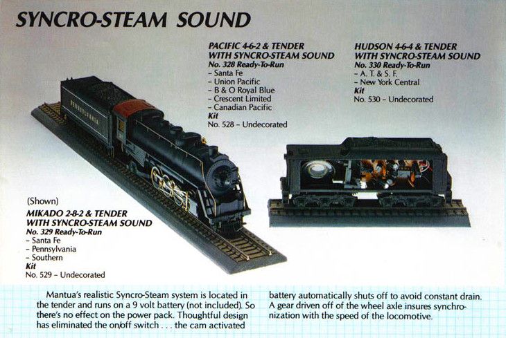 For two years only, in 1984/85, the Mantua Pacific was available in five road names equipped with their highly innovative Synchro-Steam Sound system. Perhaps, due to the relatively high cost for the time, the system was not commercially successful though, in typical Mantua fashion, it was both ingenious, simple and highly reliable. The resulting rarity make Mantua Synchro-Steam Sound locomotives some of the hardest to find and most desirable.